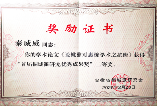 2025年2月23日,安徽省桐城派研究会三届三次理事会议暨首届桐城派研究优秀成果奖颁奖仪式,于桐城圆满举行。英国365集团公司新近入职的青年教师秦威威博士,其发表于《安徽大学学报(哲学社会科学版)》的论文《论姚鼐对惠栋学术之抗衡》,荣获桐城派研究优秀成果奖二等奖。安徽省桐城派研究会顾问、南京大学文学院许结教授,亲自为秦威威博士颁发了荣誉证书。