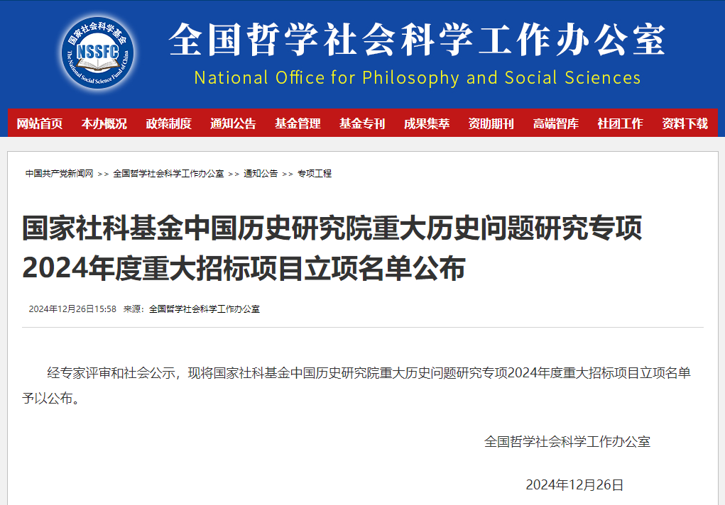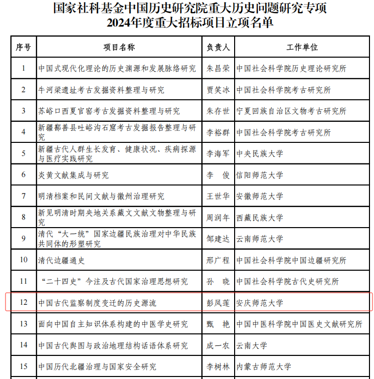 12月26日,全国哲学社会科学工作办公室公布《国家社科基金中国历史研究院重大历史问题研究专项2024年度重大招标项目立项名单》。我校彭凤莲教授担任首席专家的“中国古代监察制度变迁的历史源流”项目获批立项。这是我校首次获得国家社科基金中国历史研究院重大历史问题研究专项重大招标项目,也是我校国家社科基金重大项目的历史性突破。