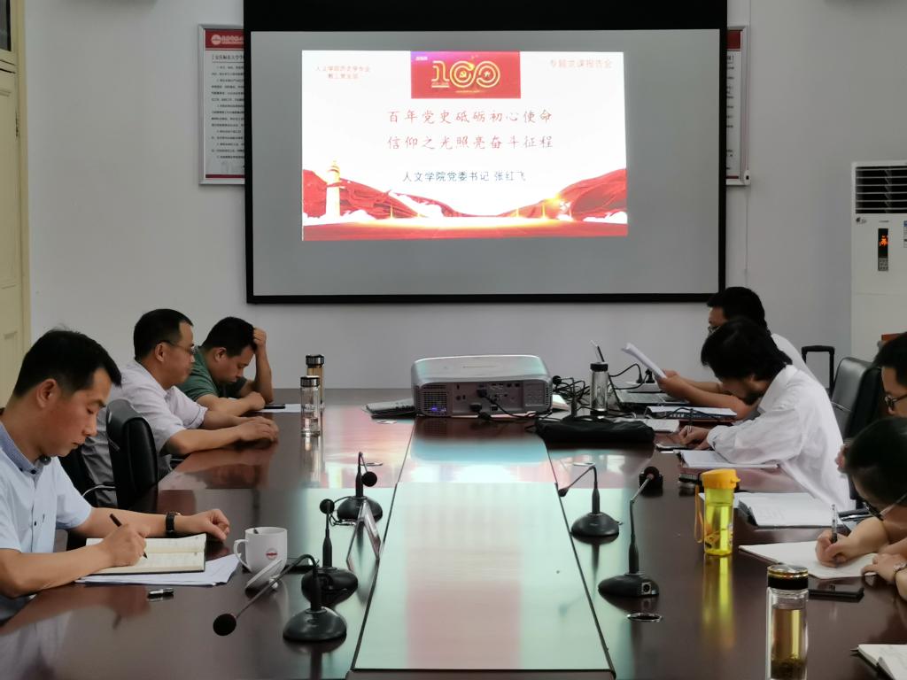 7月4日下午,学院党委书记张红飞在红楼二楼会议作了题为“百年党史砥砺初心使命 信仰之光照亮奋斗征程”的专题党课报告。英国365集团公司历史学专业教工党支部全体党员参加了报告会。历史学专业教工党支部书记李正君主持会议。