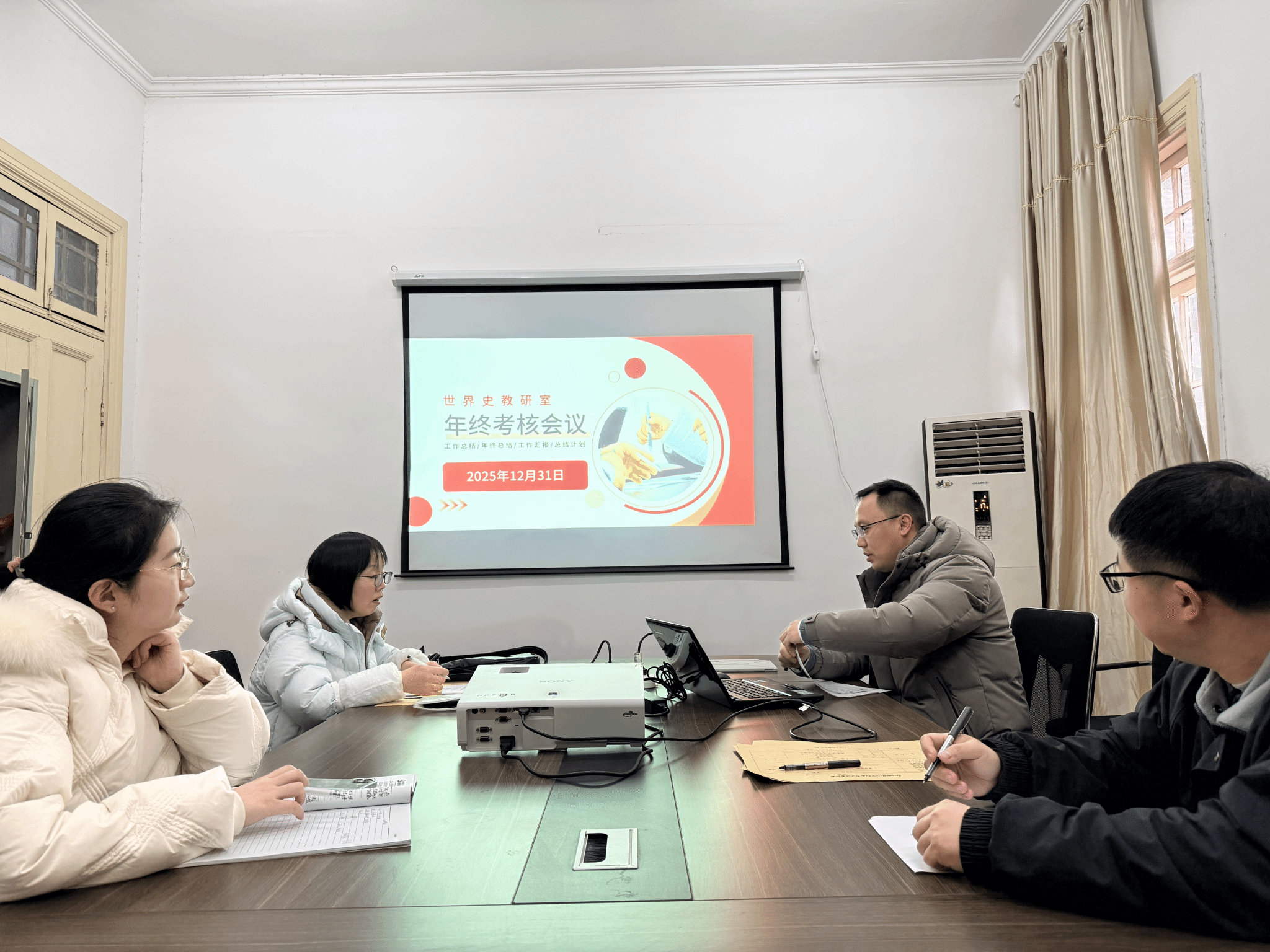 在随后举行的专题学习与教研室年终考核会议上,支部集中学习了习近平总书记重要讲话精神,围绕“以高质量党建引领学科建设”“以世界历史视野服务中国式现代化阐释”等主题开展交流研讨。与会教师结合自身研究方向,探讨了如何在世界史教学、AI智慧课程建设、区域国别研究等方面贯彻落实习近平总书记重要讲话精神。同时,会议对教研室本学期教学、科研与管理工作进行了年终总结和评优活动,系统梳理了课程建设、项目申报、学生培养等方面的成效与不足,明确了下一阶段的改进方向和重点任务。