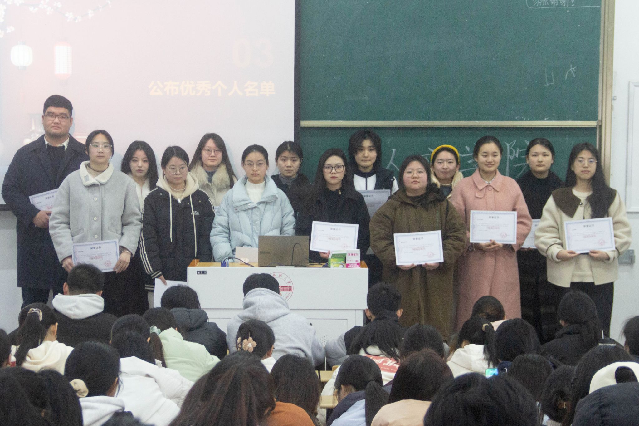 王诗瑶公布了22位“返家乡”社会实践活动优秀个人名单,获奖同学上台领取奖状并合影留念。