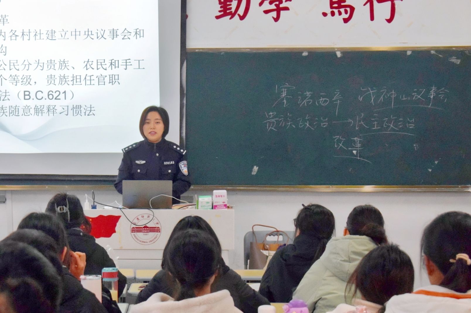 从身边人身边事入手,公安民警向大家反复强调,谨慎辨别网络信息,谨记常见诈骗手段,牢记反诈八个“凡是”,做到“四不”。学生们认真聆听民警的讲话,仔细阅读分发的反诈宣传海报。