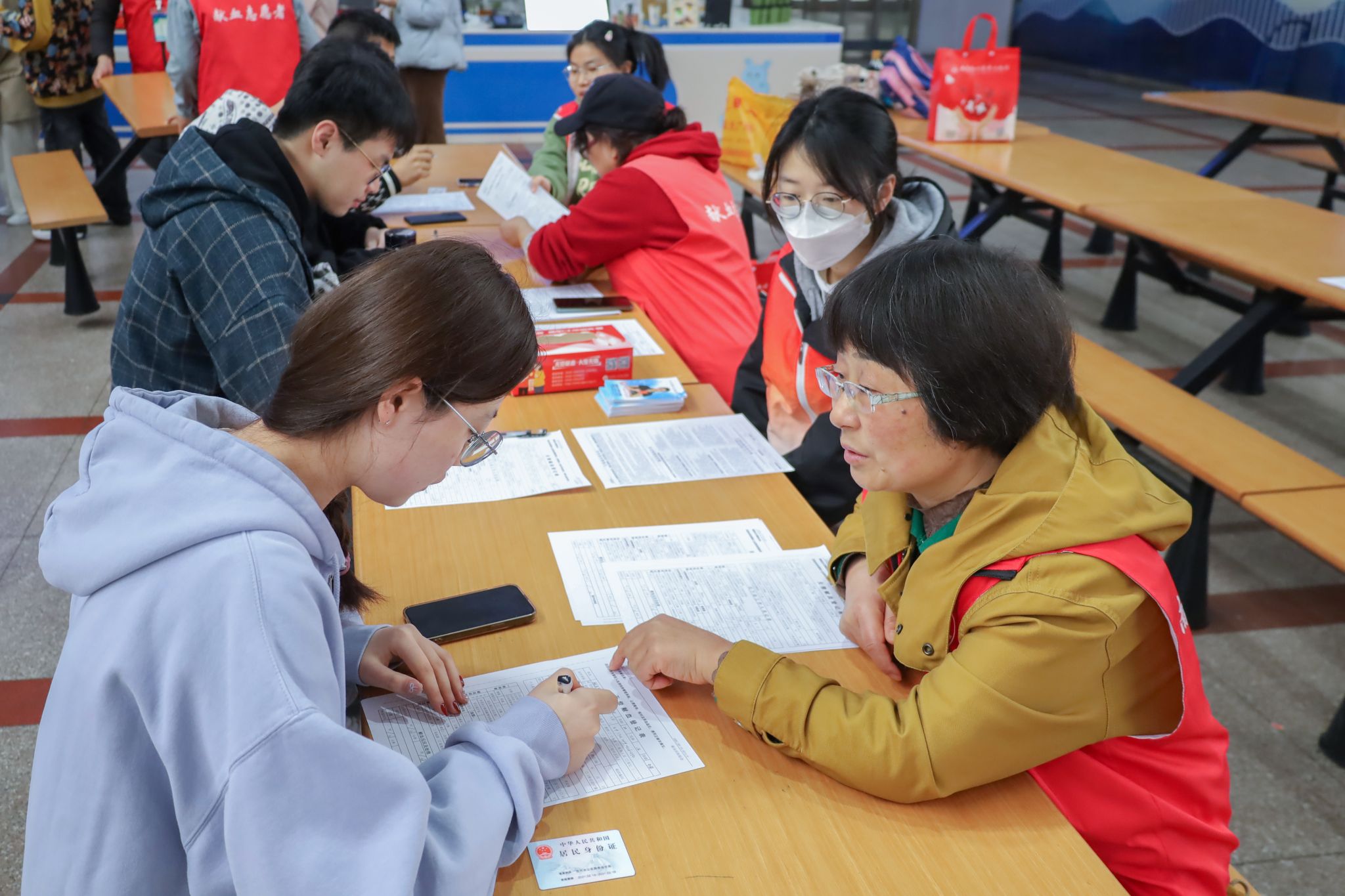 填表登记、体检、抽血、献血证发放、营养补助和献血纪念证书领取……活动中,青年突击队的志愿者们细心为前来献血的学生们提供常识咨询、提醒注意事项和提示信息填写,在医生的指导下积极参与测量血压、鉴定血型和发放献血证等具体工作,献血活动现场井然有序。
