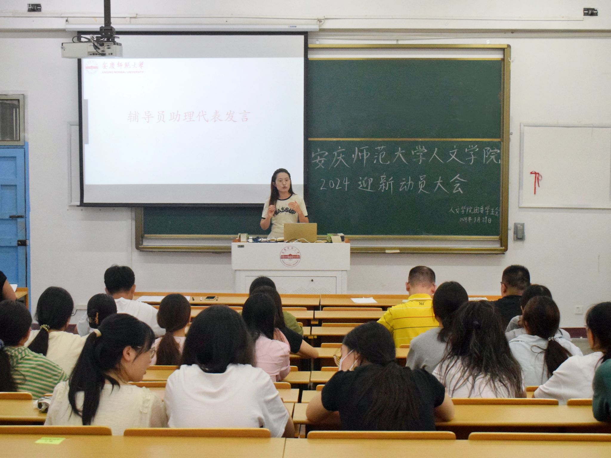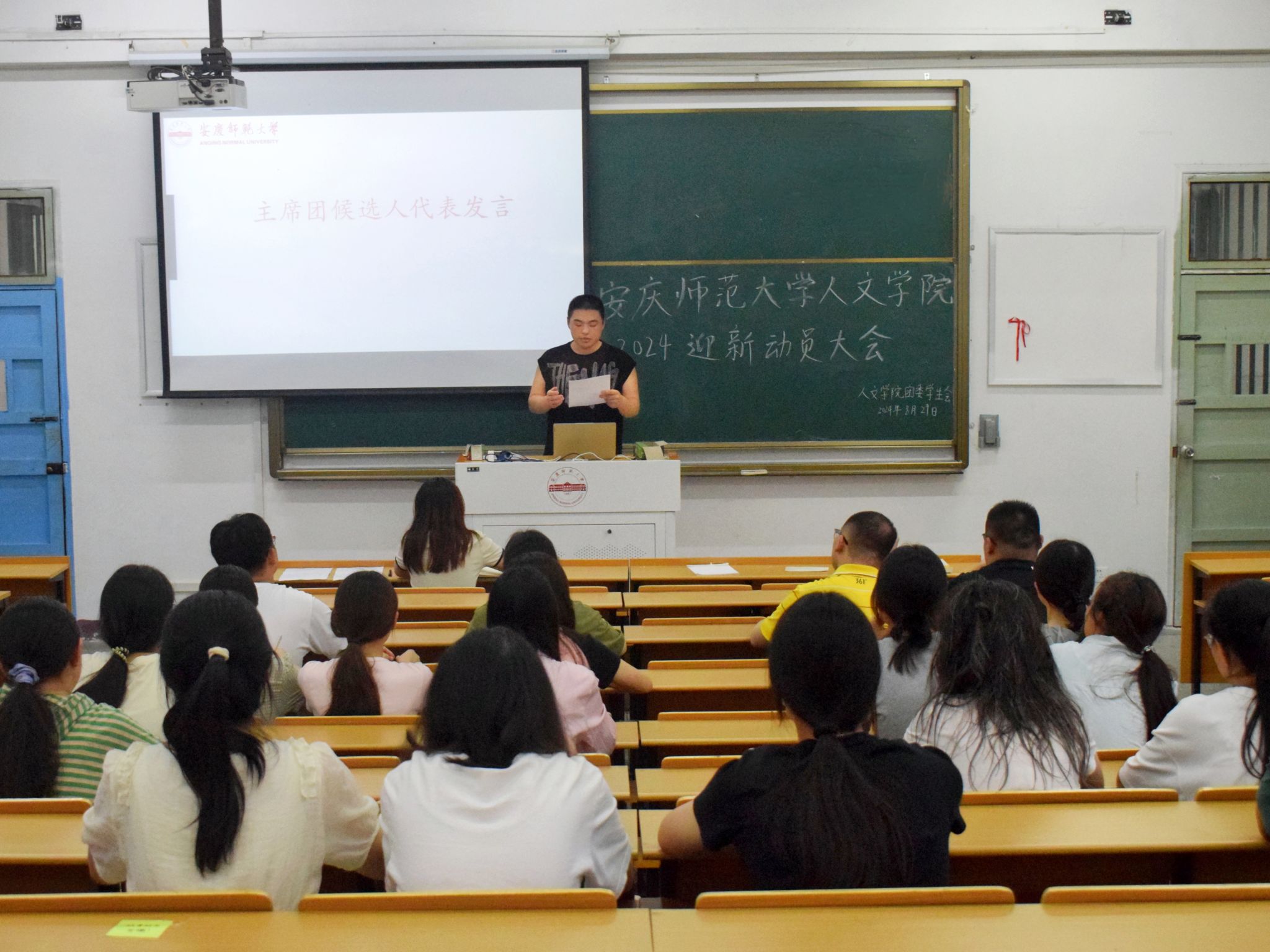 会议第一阶段,学生代表相继发言。主席团潘晨宇布置团学迎新工作,逐条讲述各岗位负责部门和各部门工作任务,强调各方面工作的注意事项和相应要求。邬诗佳代表迎新志愿者发言。他提出,志愿者们应用饱满的热情迎接新生以传递这份温暖,展示人文学子的良好风尚与优秀品质。青马班学生代表钟宇璐发言。她认为,迎新服务是一个“学做标兵骨干,担当时代重任”的过程,青马学员要用实际行动去支持迎新工作,让新生们感受到热情与温暖,也让自己在迎新过程中成长和锻炼。