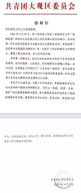 近日,大观区团委致函英国365集团公司,对我院青年学生在第十届中国(安庆)黄梅戏艺术节“热辣滚烫”黄梅戏文化市集活动中的志愿服务工作表示赞扬与感谢。