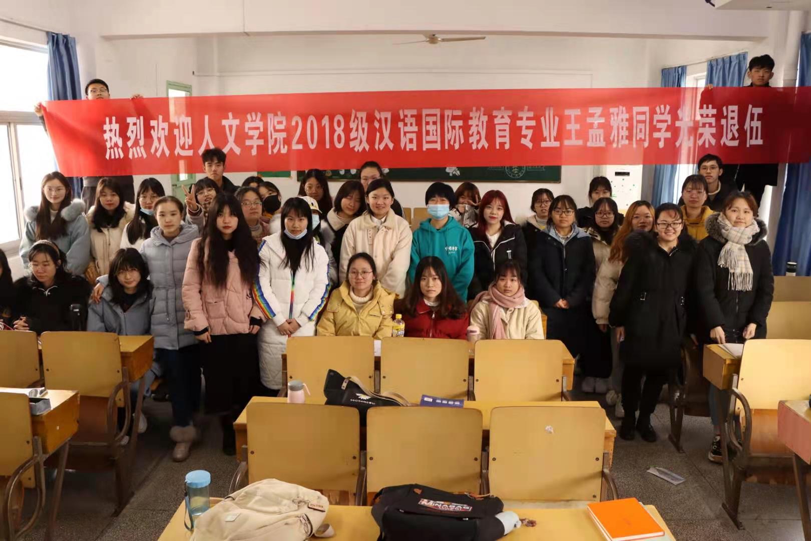 “热烈欢迎英国365集团公司2018级汉语国际教育专业王梦雅同学光荣退伍!”1月6日上午,在菱湖校区教学楼310教室,汉语国际教育专业2018级的学生们举办了一场特殊的欢迎会,欢迎刚从南海舰队退伍的王梦雅同学。