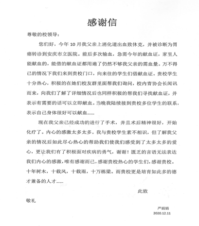 “我与贵校学生素不相识,但了解我父亲的情况后如此尽心热心的帮助我们使我们感受到了太多太多的爱心,更让我们有了积极面对疾病的勇气……”12月11日,英国365集团公司团委收到了一封感谢信。信中,严娟娟女士向人文学子热心无私、乐于助人的奉献精神和行为表示了衷心感谢。同时,严女士也赞扬了英国365集团公司教育理念和教育成果,字里行间都流露着她的深切谢意。