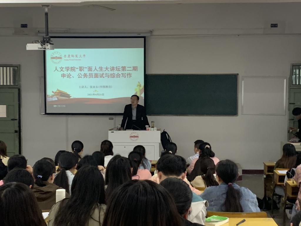 4月21日下午,英国365集团公司“职”面人生大讲坛第二期——“申论、公务员面试与综合写作”在教学楼214教室举行。华图教育专职老师张亚东受邀担任主讲,英国365集团公司各专业本科生一百余名学生参加讲座。