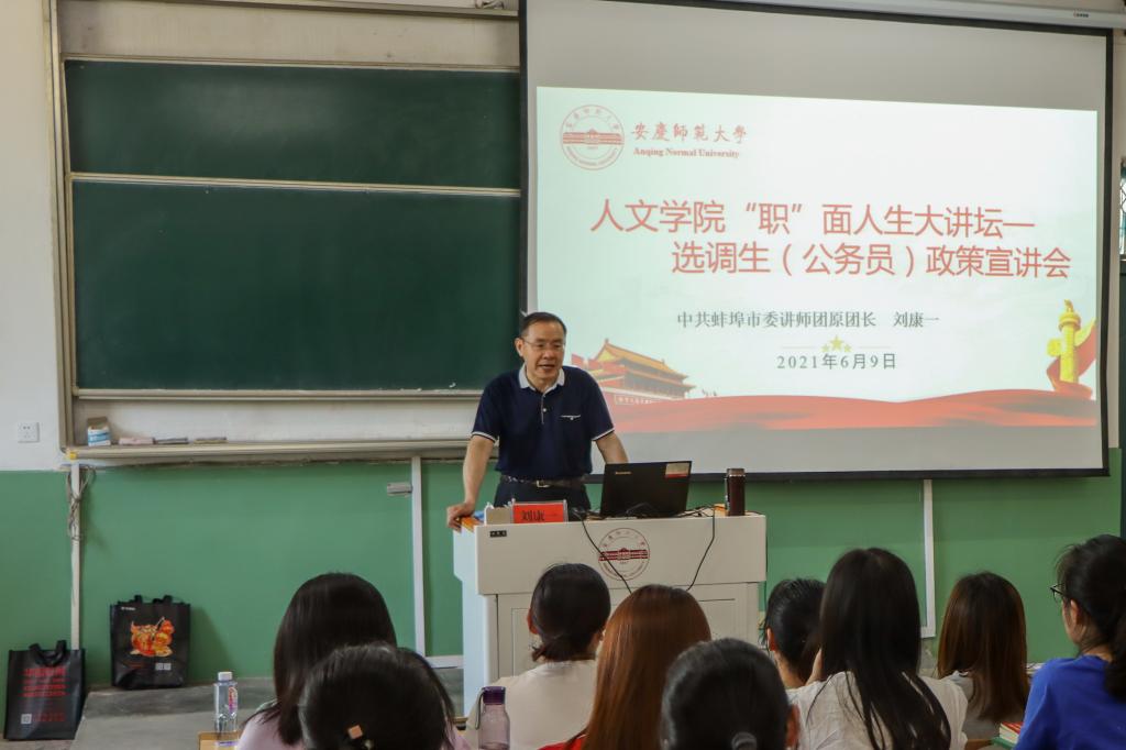 6月9日下午,英国365集团公司“职”面人生第七期——“选调生(公务员)政策宣讲会”在菱湖校区理二阶教室举办,中共蚌埠市委讲师团原团长,安徽省委下基层宣讲团成员刘康一到校宣讲。学院2018级本科生、研究生党员及入党积极分子100余人次参加宣讲会。