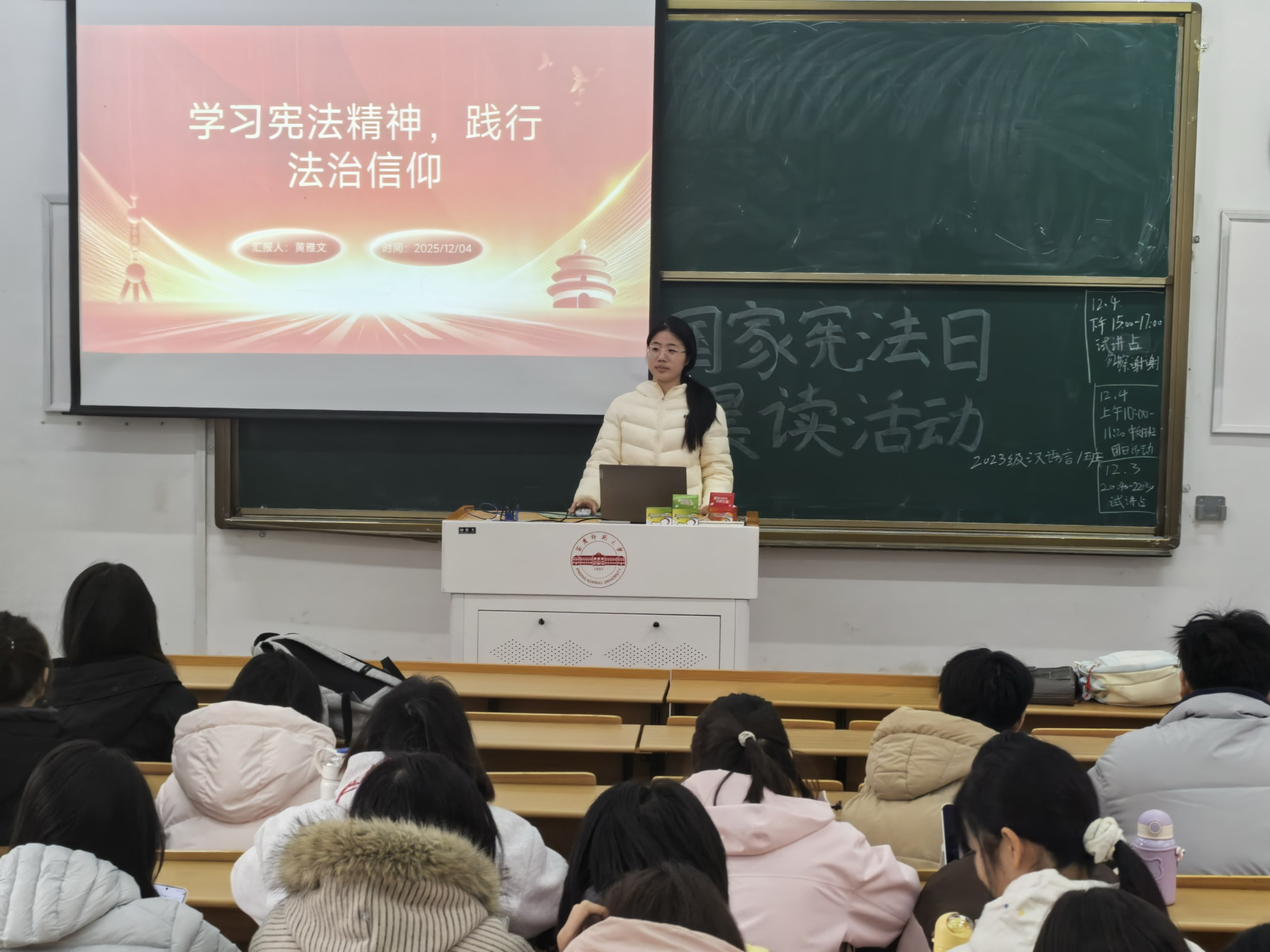 2023级汉语言文学专业1-5班团支书组织班级同学收看全国教育系统“宪法晨读”活动直播。全体学生认真学习宪法,集体跟唱主题歌曲《宪法伴我们成长》,观看第十届全国学生“学宪法 讲宪法”比赛优秀作品展演。“本宪法以法律的形式确认了中国各族人民奋斗的成果。”宪法晨读环节,全体学生起立,齐读宪法核心条款,在庄严的仪式中深入体会宪法的基本原则和精神。