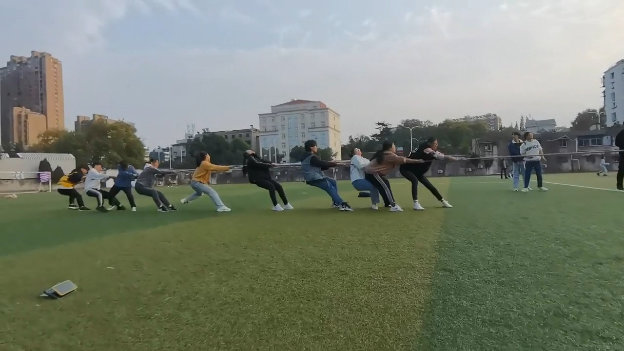 一切准备就绪,拔河比赛开始了。随着一声哨响,参赛队员们口中一起高呼“一二,一二……”他们拼尽全力为集体荣誉而战。伴随着一阵哨声,比赛的激烈场面被打破,随即而来的是满场的欢呼声,他们或欢喜,或遗憾,但都对比赛结果坦然接受,这就是人文学子的拼搏精神!