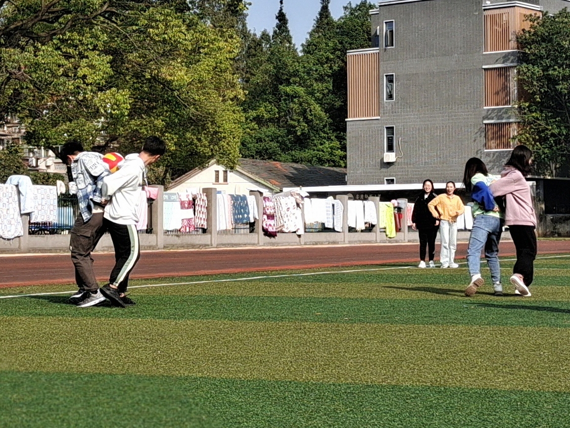 本次趣味运动会共分为合作运球接力、两人三足、打保龄球、拔河四个运动项目,由2020级和2021级学生自行组队参赛。手挽手,背靠背,带着排球共同进退,同学们每两人一组,背靠背把排球夹在两人中间,往返二十米,途中若球掉落则要回到起点重新开始,这便是合作运球接力赛,比赛场面热闹非凡。