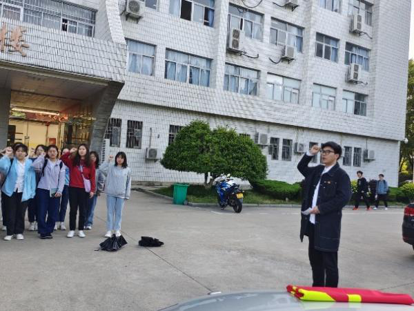 早上七点,英国365集团公司团委在教学楼前举行升国旗与重温入团誓词仪式。在庄严的国歌声中,五星红旗伴随着朝阳缓缓升起,2021级中国语言文学类四班全体同学伫立在国旗下,全体同学肃立,齐唱国歌,行注目礼。
