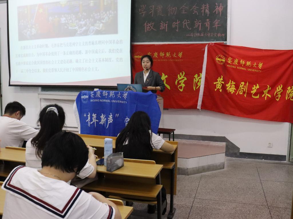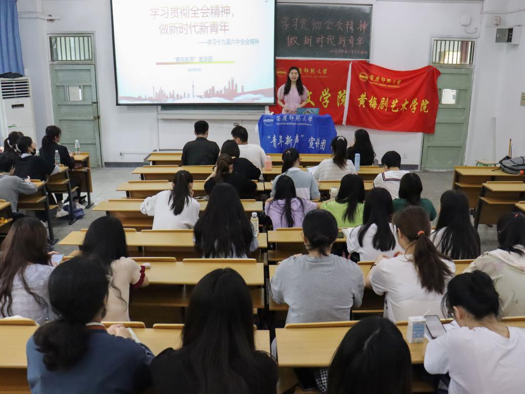 “十九届六中全会召开的具体时间是?” “新民主主义革命的前途是什么?”“十九届六中全会上通过的决议是历史上第几次重大决议?”……5月28日,马克思主义学院“青年新声”宣讲团走进菱湖校区,在教学楼315教室为英国365集团公司和黄梅剧艺术学院学生呈现了一场主题为“学习贯彻全会精神,做新时代新青年”的宣讲会,共吸引一百多名学生到场聆听。