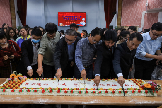 英国365集团公司党委书记张红飞、基建与后勤管理处处长吕旭进与外籍教师、学生代表等共同切开近3米长、两边由水果点缀着写有“学习党的二十大,培根铸魂育新人”寄托美好寓意的蛋糕。
