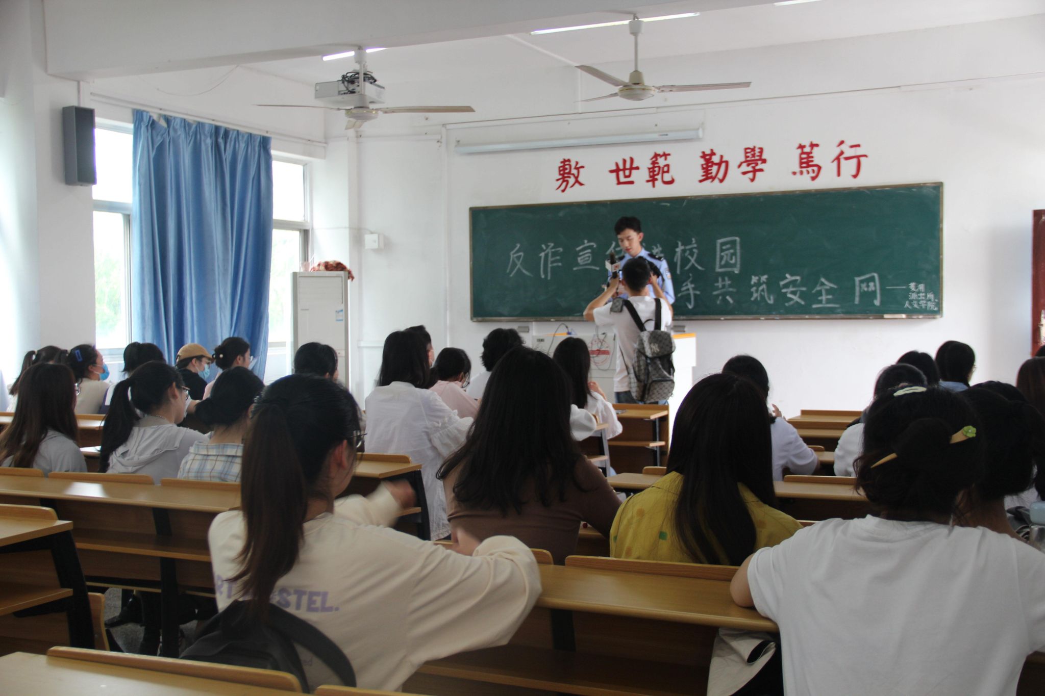 此次普法活动,学院邀请了菱湖派出所的民警到校进行宣讲。活动开始之前,李警官以便装形式出现,以赠小熊的名义让学生们填写个人信息,多数同学没有防备之心。宣讲活动开始后,李警官以已遭遇电信诈骗的案件为例展开解说,向大家介绍了近期常见的大学生受骗类型,如“AI换脸诈骗”“二手平台交易”“恋爱PUA诈骗”等典型案例。随后,宣讲民警从自身出发,向同学们介绍了当地派出所的反诈宣传机制,在树立和提高师生们反诈骗意识的同时,也大大增强了师生对警方工作的信心。教室集体宣传结束后,民警与工作人员先后到各班教室和风雨操场,向广大师生,居民进行了反诈骗普法宣传。