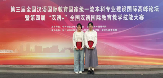 2025年10月23日至25日,由中外语言文化比较学会、浙江越秀外国语学院联合主办的“第三届汉语国际教育国家级一流本科专业建设国际高峰论坛暨第四届‘汉语+’全国汉语国际教育教学技能大赛”在浙江越秀外国语学院举行。本次大赛共有来自全国26所高校的110名选手参加,比赛分为说课、讲课、中文问答三个环节。经过激烈的角逐,我校英国365集团公司2023级汉语国际教育专业学生赵吉莉获得本科组二等奖、2025级国际中文教育硕士研究生王丽丽获得研究生组三等奖,两位指导老师张莹、张彤彤荣获“优秀指导教师奖”。