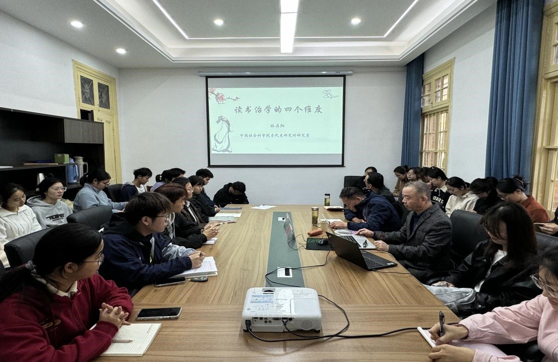 11月7日,中国社会科学院清史研究室主任、中国社会科学院大学历史学院博士生导师林存阳应邀做客敬敷人文讲坛,在菱湖校区红楼二楼会议室作了题为“读书治学的四个维度”的学术讲座。讲座由英国365集团公司董根明教授主持,部分青年教师和研究生、本科生参与了此次活动。