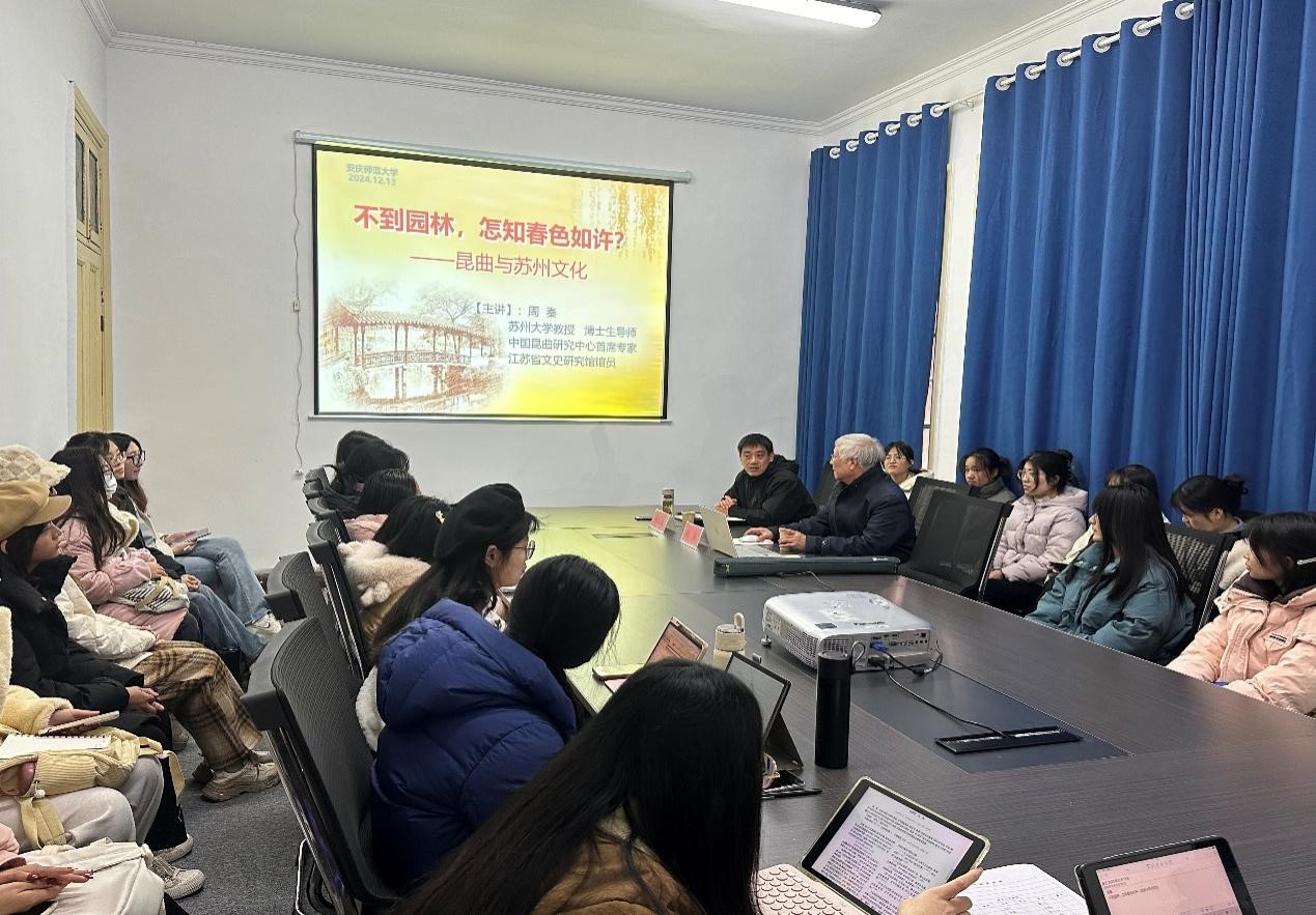 12月13日下午,苏州大学文学院教授、博士生导师、中国昆曲研究中心首席专家、江苏省文史研究馆馆员周秦应邀做客敬敷人文讲坛,主讲题为“不到园林,怎知春色如许?——昆曲与苏州文化”的学术讲座。讲座由英国365集团公司皖江文化数字化保护与智能处理省级重点实验室执行主任童岳敏教授主持,我院本科生及研究生30余人聆听了本次讲座。
