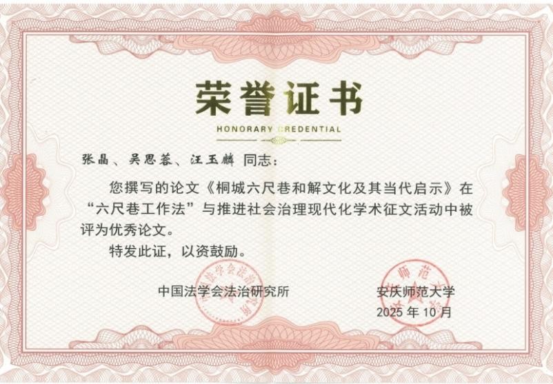 会上,我院2024级历史学(师范)二班学生张晶、汪玉麟、吴思蓉组成的国家级大学生创新创业训练项目研究团队提交的阶段性成果《桐城六尺巷和解文化及其当代启示》获评大会优秀论文。该成果系统阐述了桐城六尺巷和解文化的历史渊源、深层内涵及其在当代社会治理中的现实意义,指出其以“礼让共生、和谐共治”为核心,是中华优秀传统文化创造性转化与创新性发展的典范。参会期间,团队还赴桐城六尺巷治理学院开展了实地考察调研。