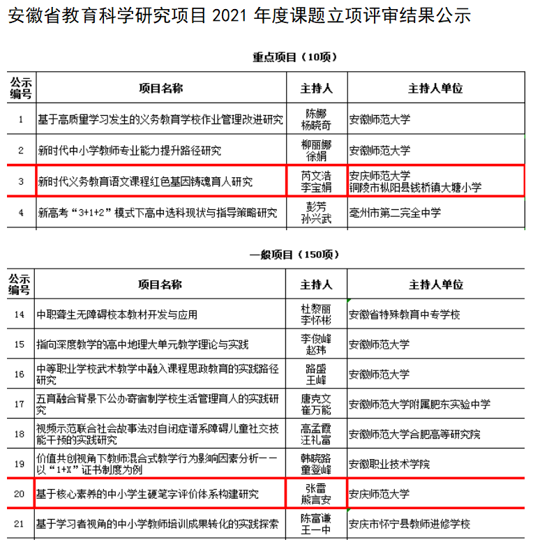 10月8日,安徽省教育厅公示了2021年度教育科学研究项目课题立项评审结果,包含重点项目10项,一般项目150项。我院芮文浩副教授的《新时代义务教育语文课程红色基因铸魂育人研究》获批重点项目。张雷老师、熊言安副教授的《基于核心素养的中小学生硬笔字评价体系构建研究》获批一般项目。我院高度重视科研工作,两项教育研究项目的入选是我院在学科建设和科研方面取得的重要收获,相关成果对汉语言文学专业认证工作也将起到积极作用。