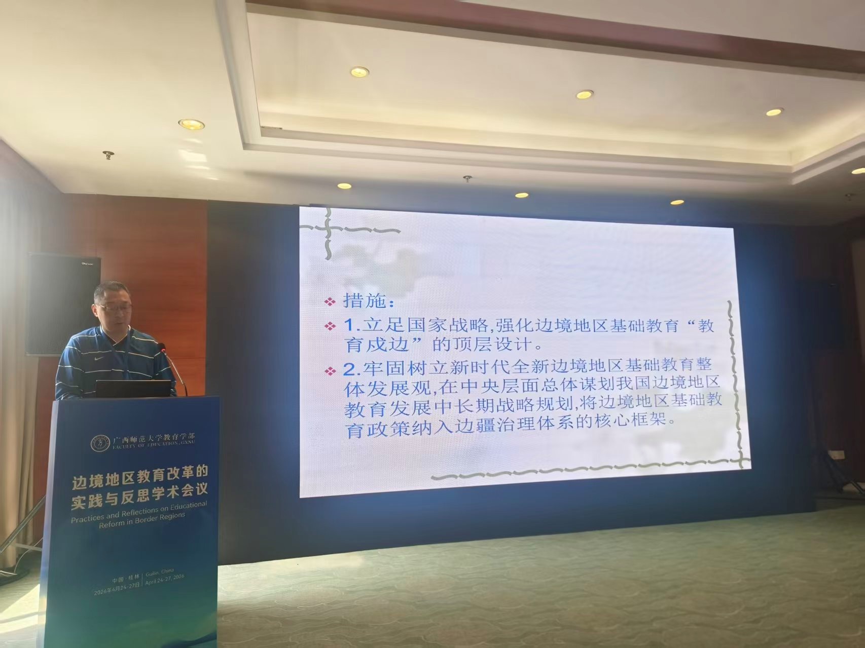 2026年4月25至26日, 由广西师范大学教育学部举办的边境地区教育改革的实践与反思学术研讨会在桂林召开。来自美国、加拿大、澳大利亚等国外高校相关学者以及全国高校、科研院所从事相关研究的专家学者参加本次学术会议。英国365集团公司教授、学科语文方向硕士生导师蔡洞峰老师应邀参加会议,并提交题为《文化认同视域下边境地区教育发展路径探索》的参会论文。