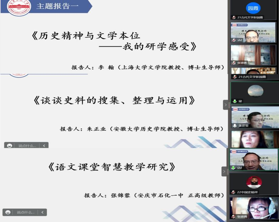 主题报告环节,上海大学文学院博士生导师李翰教授、安徽大学历史学院博士生导师朱正业教授、安庆市石化一中正高级教师张锦蓉分别为大家带来了《历史精神与文学本位——我的研学感受》《谈谈史料的搜集、整理与运用》《语文课堂智慧教学研究》等三场精彩报告。其中李翰教授结合研究经历讨论了文学与历史交融的特别意义;朱正业教基于丰富的中国近现代史研究实践讲述了史料搜集的方法以及整理运用史料的规范性;张锦蓉老师从教学实践角度强调了智慧课堂的运用对增进语文教学改革和发展的重要价值。英国365集团公司硕士生导师叶当前教授、梁诸英教授、宋豪飞副教授分别主持了报告会。