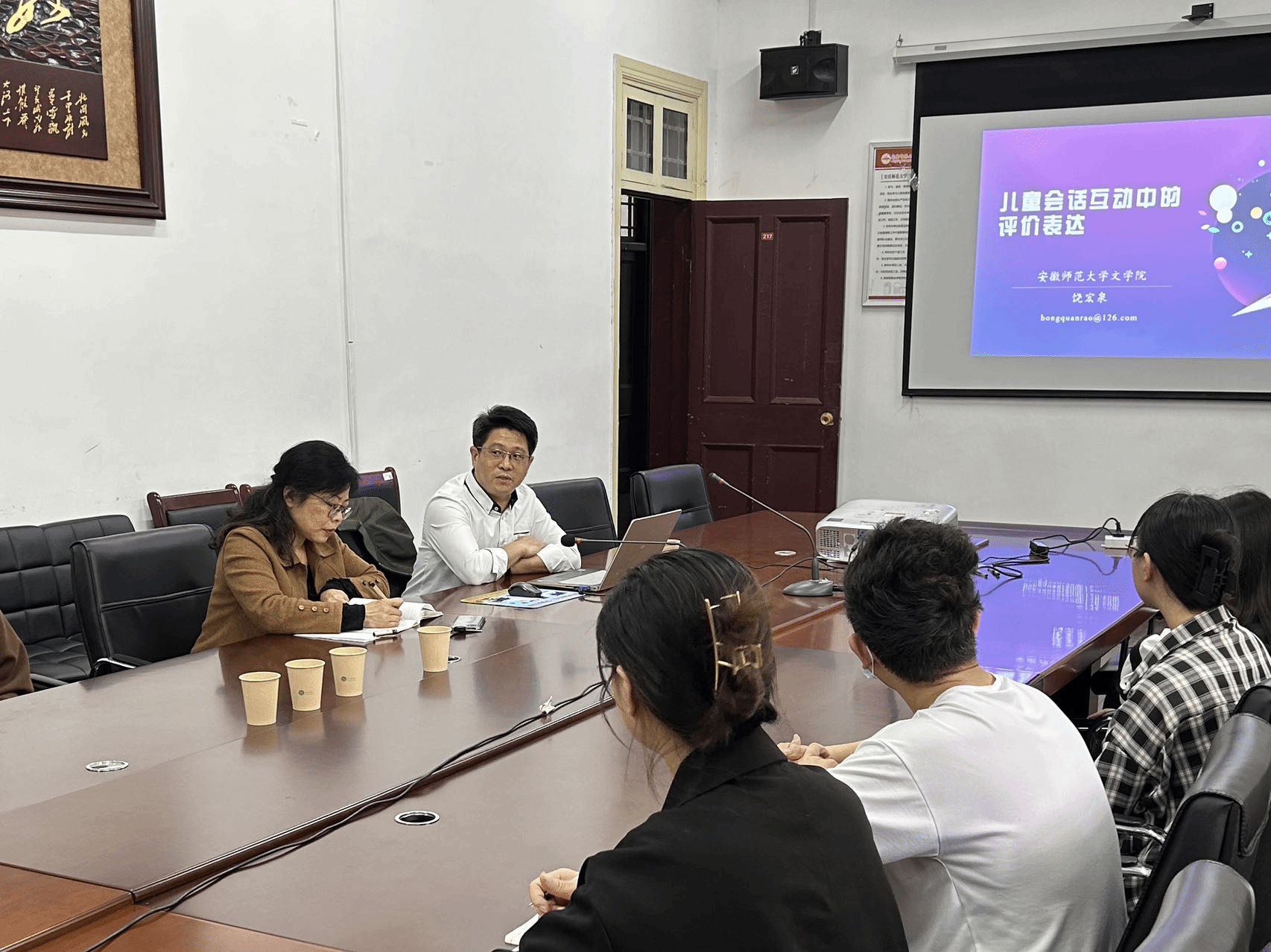 5月24日下午,安徽师范大学饶宏泉副教授应我院邀请在红楼会议室作了题为“儿童会话互动中的评价表达”的学术讲座。本场讲座由鲍红教授主持,部分研究生、本科生共20余人参与了此次活动。