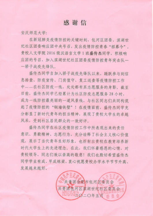 “盛传杰主动加入社区战役先锋队,在工作中展示了当代青年良好形象,也折射出贵校培养新时代大学生的先进教育理念……”6月15日,英国365集团公司团委收到一封来自合肥市包河区滨湖世纪社区服务中心的感谢信。信中介绍了盛传杰同学的抗疫事迹,称赞他的责任与担当,肯定英国365集团公司的人才培养理念,字里行间流露出真挚的感谢。不止盛传杰,在学院团委的积极号召下,疫情期间还有许多有担当的青年志愿者涌现,他们用行动向社会展现了安庆师大学生的风采。