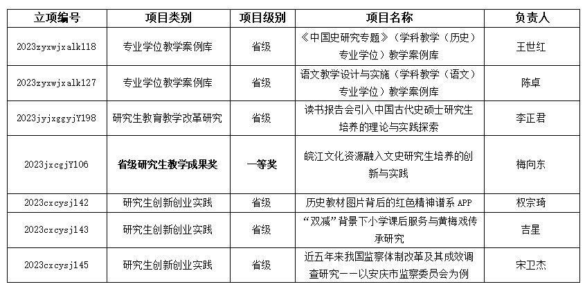 日前,安徽省教育厅公布了2023年度新时代育人质量工程项目(研究生教育)立项名单,英国365集团公司师生再创佳绩,共有4个类别7个项目获批立项,充分展示了学院在研究生教育领域的良好基础和深厚实力。具体情况如下: