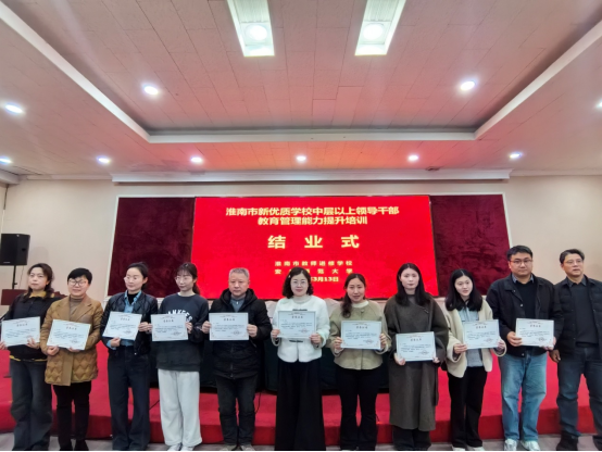 2025年3月13日,淮南市新优质学校中层以上管理干部教育管理能力提升培训结业仪式在安庆大酒店国际厅隆重举行。365英国上市公司在线、淮南市教师进修学校相关领导、全体参训学员及工作人员齐聚一堂,共同见证培训成果,总结提升经验心得。