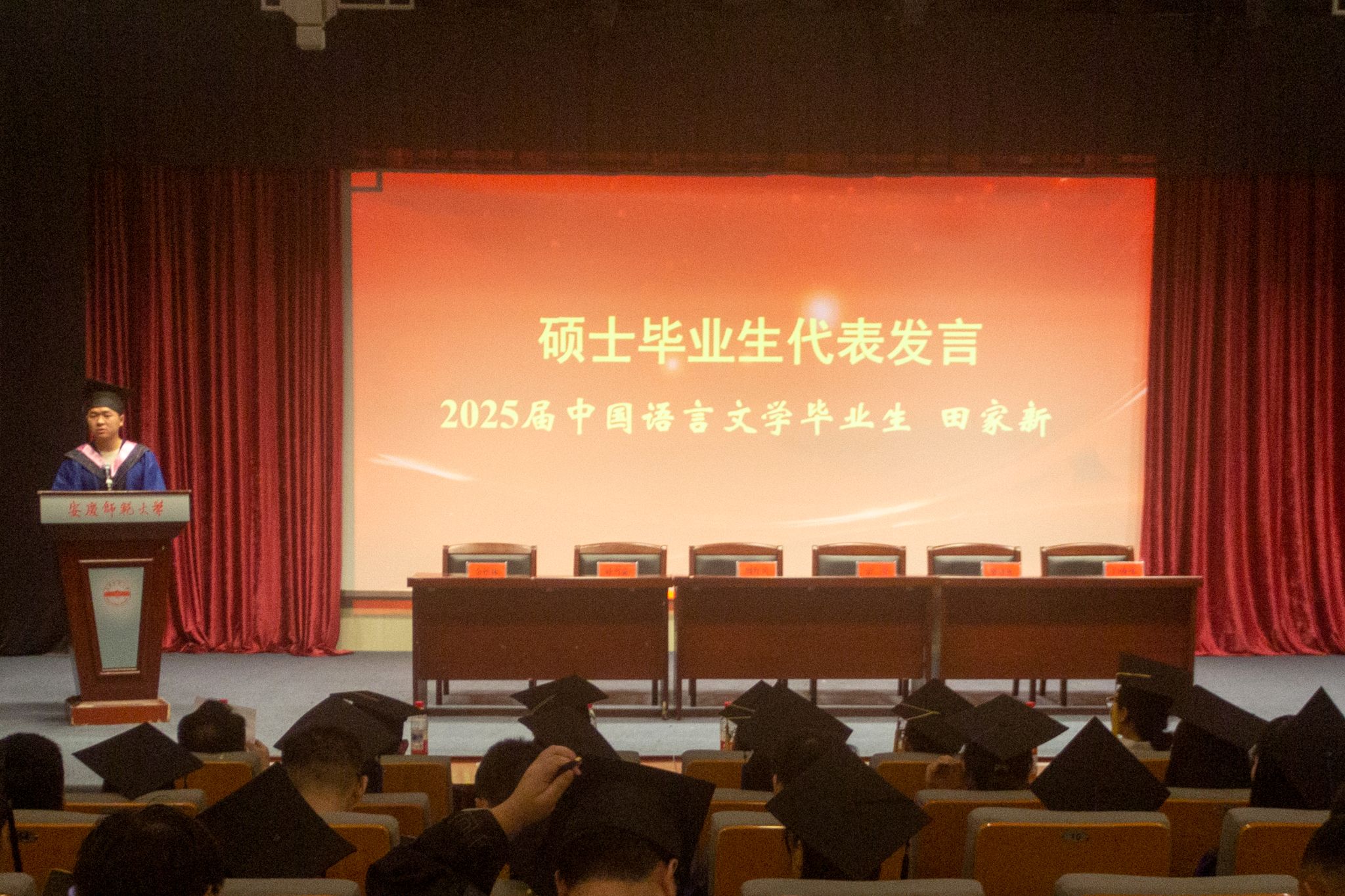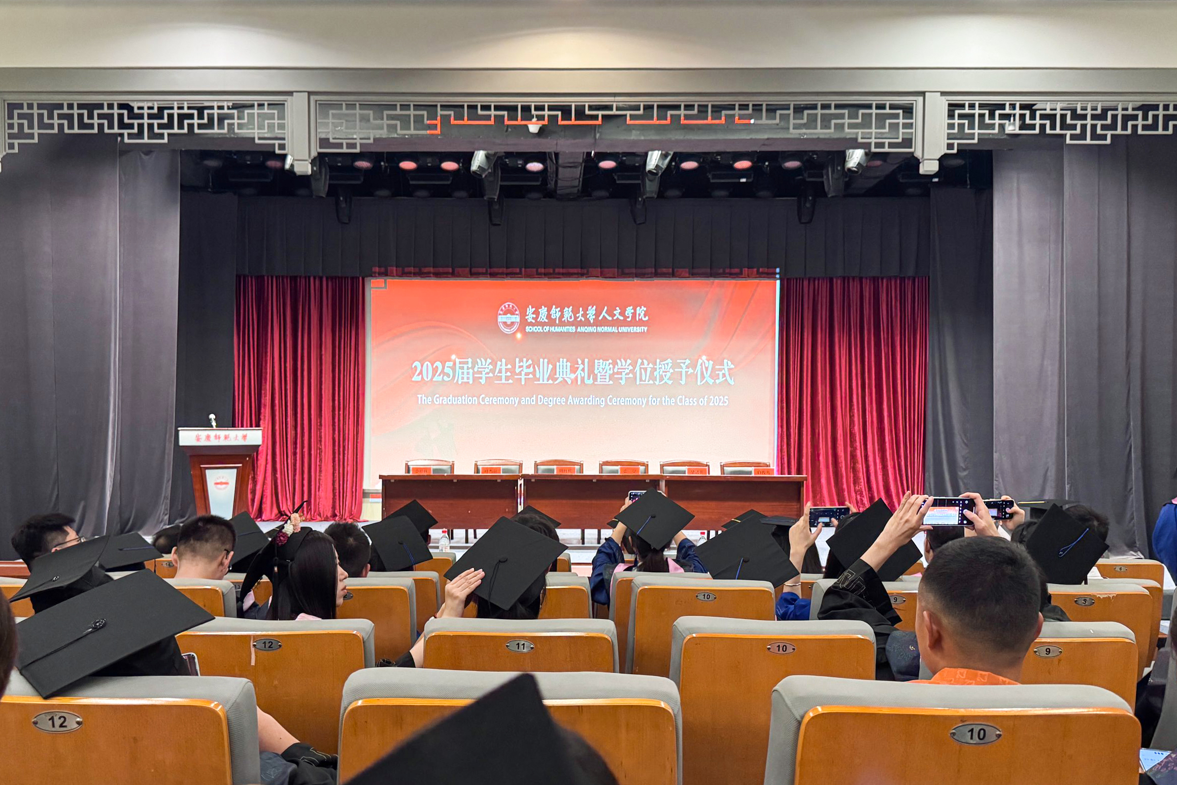 典礼在庄严的国歌声中正式拉开帷幕。仪式现场,学院线上转播了学校毕业典礼。