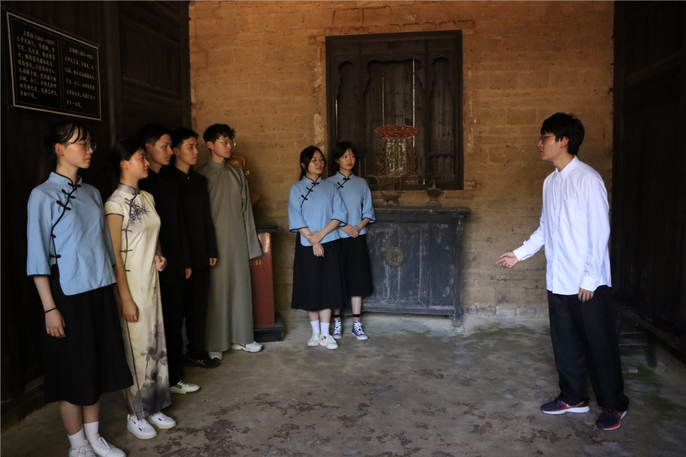 在王步文故居,话剧社的学生们还换上演出服装,再演话剧情节,切身感知历史人物的无畏牺牲精神。王步文的饰演者是汉语言文学专业2019(1)班的李子健,提及这次参观旧址的经历,他表示:“当我站在王步文曾经生活、奋斗过的地方,通过实地考察的形式走近他的革命一生,我更能感受到他的爱国情怀和坚定信仰!”