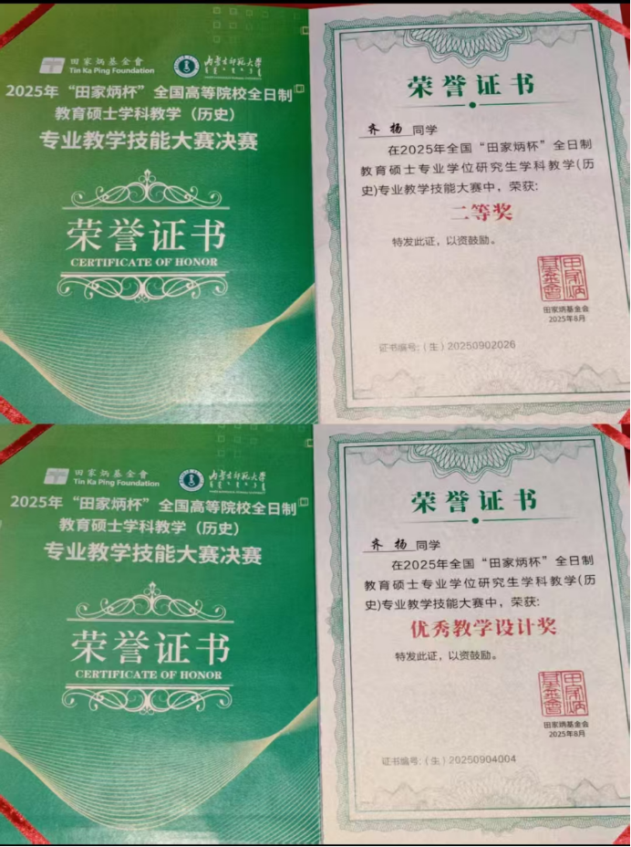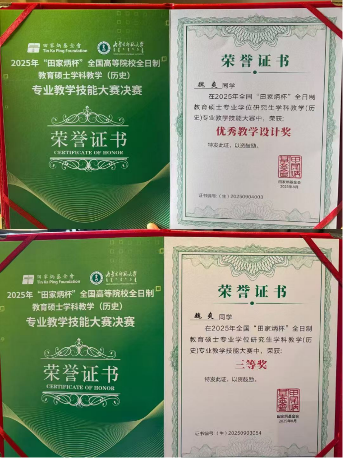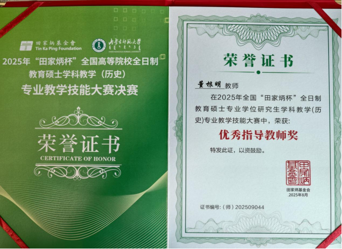 2025年8月22日至25日,由“田家炳杯”全日制教育硕士专业学位研究生教学技能大赛专家委员会指导、“田家炳教育基金会”冠名,内蒙古师范大学主办的2025年“田家炳杯”全国高等院校全日制教育硕士学科教学(历史)专业教学技能大赛决赛在呼和浩特举行。本次决赛汇聚了全国84所院校160余名全日制学科教学(历史)专业硕士研究生,搭建起高校间教学实践交流的优质平台。我校2023级学科教学(历史)研究生齐扬、魏爽参赛,英国365集团公司葛俊超博士带队。