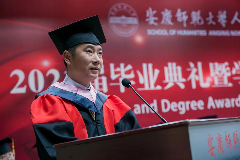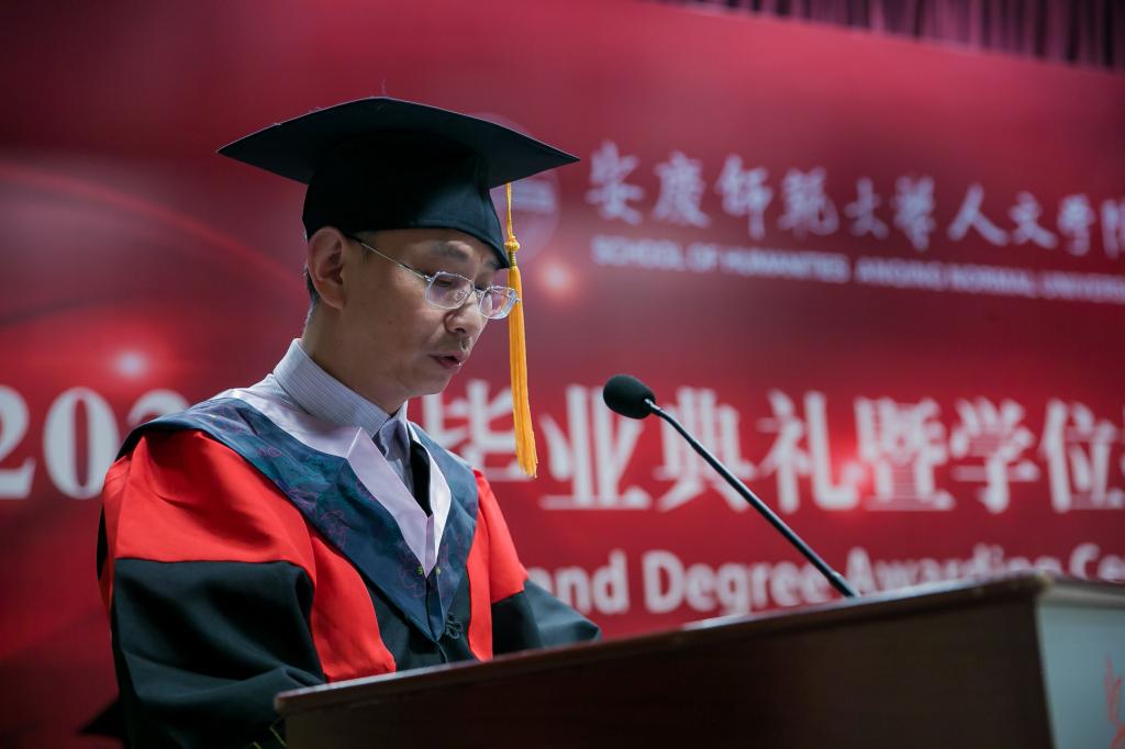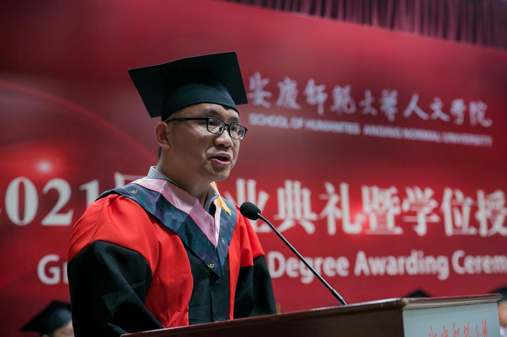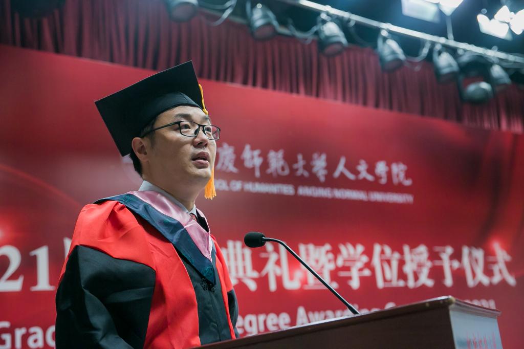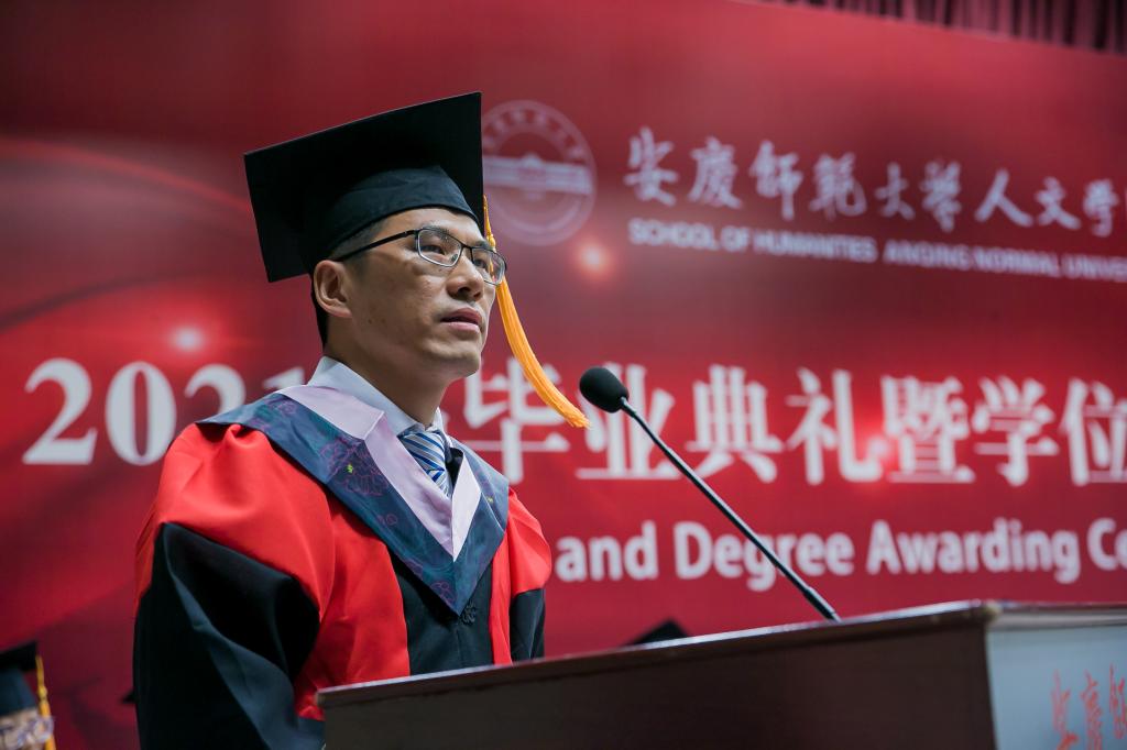 校“三全育人”最美教师、英国365集团公司教授、硕士生导师江飞作为教师代表为毕业生送上祝贺与期待。他勉励毕业生永远不要忘记自己作为人文知识分子身份和责任,成为一个脚下有根心中有光的人。
