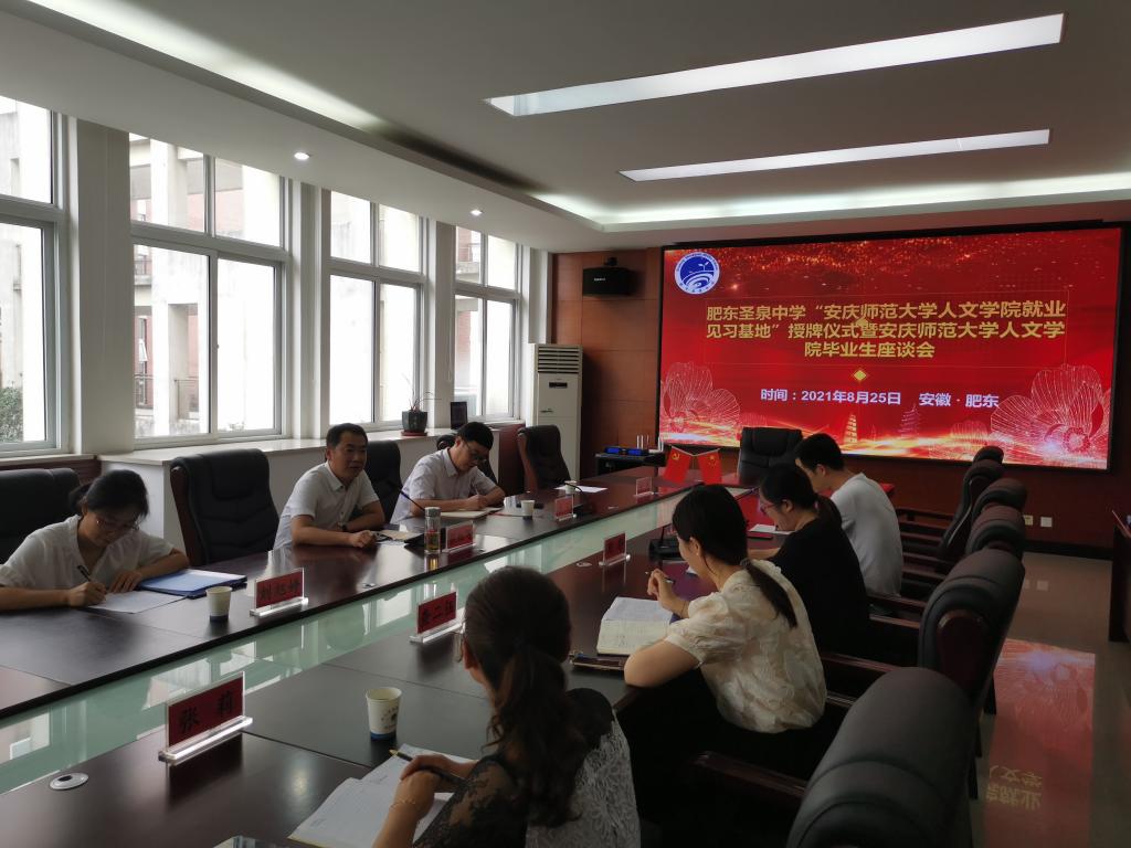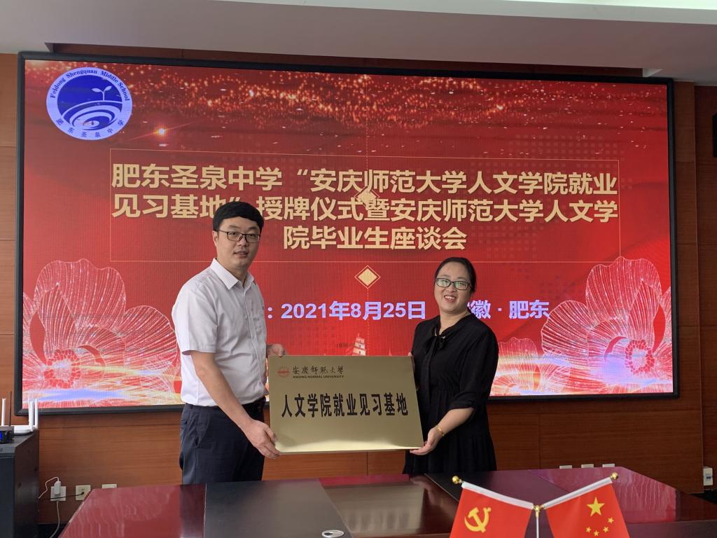 党委副书记王波代表学院为肥东圣泉中学授予“英国365集团公司就业见习基地”牌匾。与会人员就人才培养质量、就业见习基地建设等方面展开了深入交流。