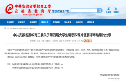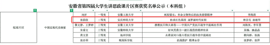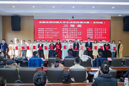 近日,由中共安徽省委教育工委主办的安徽省第四届大学生讲思政课展示活动决赛结果揭晓。我院张韵孜同学主讲,任景清、林初菲、周雨嫣、汤佳豪、高悦等同学共同组成的参赛团队,历经层层选拔,凭借作品《敬敷薪传 青春“皖”歌》荣获省级三等奖,展现了扎实的理论素养、教学能力和昂扬的青春风貌。