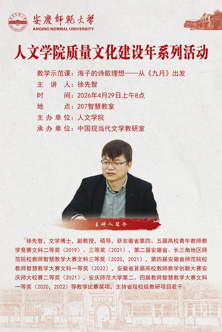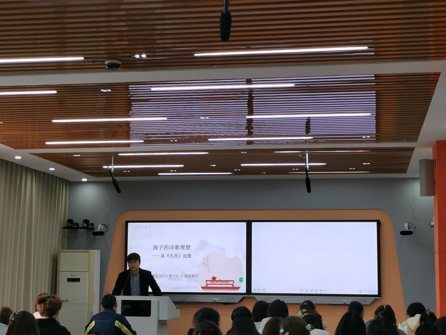 徐先智副教授以《海子的诗歌理想》为主题,以《九月》一诗为例,呈现了一堂精彩的现当代文学课。徐先智老师以播放民谣歌手周云蓬的歌曲《九月》为教学切入点,通过民谣歌手的演唱让学生初步体会《九月》一诗的情感基调,并抛出“为何周云蓬将‘马头’改为‘马尾’”这一问题,引导学生进一步思考海子诗歌中意象的选取。随后,徐先智老师为学生讲解海子生平,并细究海子诗歌中的意象,分析海子的诗歌理想。在教学过程中,徐先智老师注重启发学生,旁征博引,通过层层递进的问答,借助不同诗人对意象使用的差异,将海子在《九月》一诗中呈现出来的诗歌特点展现得淋漓尽致,充分展现了现当代文学教学的审美与文化兼具的教学特色。