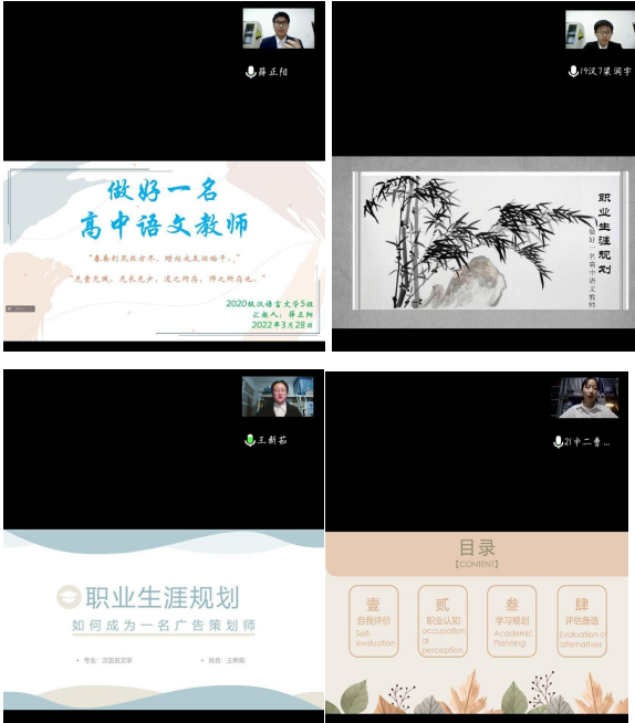 本次大赛分为职业生涯规划书评选和现场答辩两个环节。在职业生涯规划书中,选手们理性分析了自身的职业性格、兴趣、价值观、能力等特质,充分利用相关专业知识对职业世界认真探索,将自我认知与职业认知相结合,对未来的职业生涯进行了详细且合理的规划。在线上答辩环节,选手们利用PPT和简短有力的发言,对自我认识和外部环境进行了全面分析,提出了自己的职业目标、发展路径和行动规划,精确地阐述了自己的观点,表达了自己的职业需求和具体规划。面对紧张的时间计时,他们充分保持冷静,思维敏捷,应答自如,展现出优秀的素质。最后,由评委根据选手职业规划书及线上展示为选手打分。