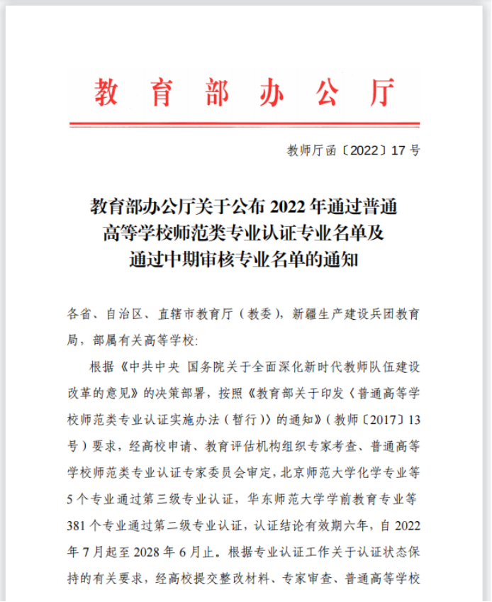 近日,教育部办公厅公布了2022年通过普通高等学校师范类专业认证专业名单,英国365集团公司汉语言文学专业顺利通过师范类专业中学教育第二级认证。英国365集团公司汉语言文学专业最早可追溯至20世纪20年代至30年代省立安徽大学时期,建国后于1977年开始本科招生,经过四十余年的持续建设,汉语言文学专业先后获批国家级一流本科专业建设、省级综合改革试点专业、省级特色专业、省级一流人才示范引领基地、省级“六卓越、一拔尖”卓越人才培养创新项目建设点,并于2019年获批为安徽省博士学位授权立项建设学科、安徽省高峰培育学科。
