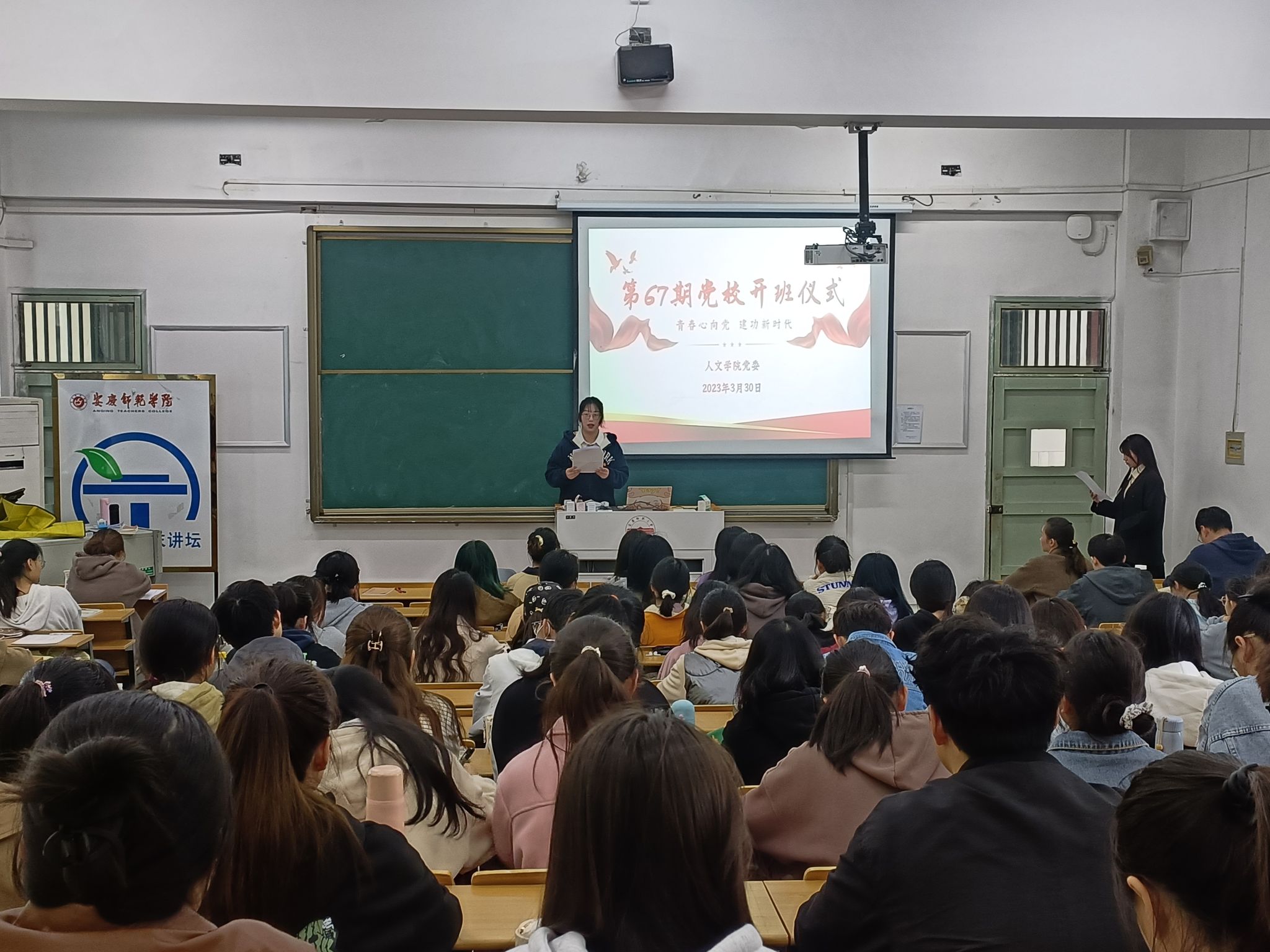 开班仪式在庄严的国际歌中拉开序幕。历史学专业2021级(3)班吴照雨同学代表全体学员发言,她表示站在历史与未来的交汇点,本期培训班115名入党积极分子聚集在一起,展开深入学习与热烈讨论具有重要意义。从党的二十大到2023年全国两会,宏伟蓝图鼓舞人心,时代号角催人奋进。全党全国各族人民更加紧密地团结在以习近平同志为核心的党中央周围,凝聚起建设中国式现代化的磅礴力量,向着民族复兴的光明未来阔步进发。作为新时代青年,青春逢盛世,奋斗正当时,大家要永远跟党走,奋进新时代。她结合自己大学以来的学习实践,号召全体学员要奋进助力时代,奏响梦想之音;要树立崇高理想,敢于拼搏担当;要紧跟全新变局,推动创新发展。