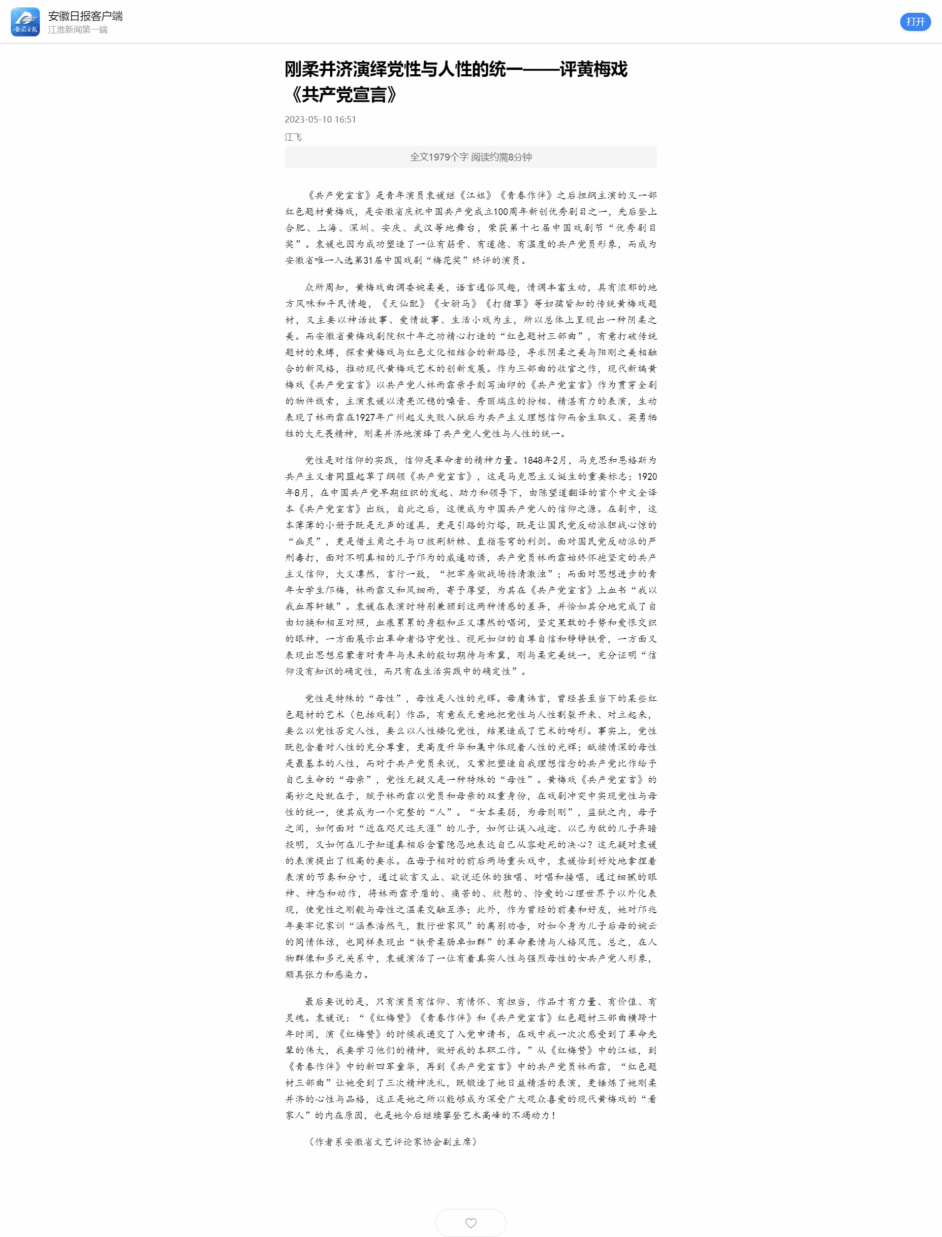 近日,《安徽日报》刊发我院江飞教授撰写的评论文章《刚柔并济演绎党性与人性的统一——评黄梅戏<共产党宣言>》。该文以现代新编黄梅戏《共产党宣言》为例,阐述了现代黄梅戏创作积极探索黄梅戏与红色文化相结合的新路径,积极宣扬作品主人公为共产主义理想信仰而舍生取义、英勇牺牲的大无畏精神,褒扬了主演刚柔并济地演绎了共产党人党性与人性的统一。