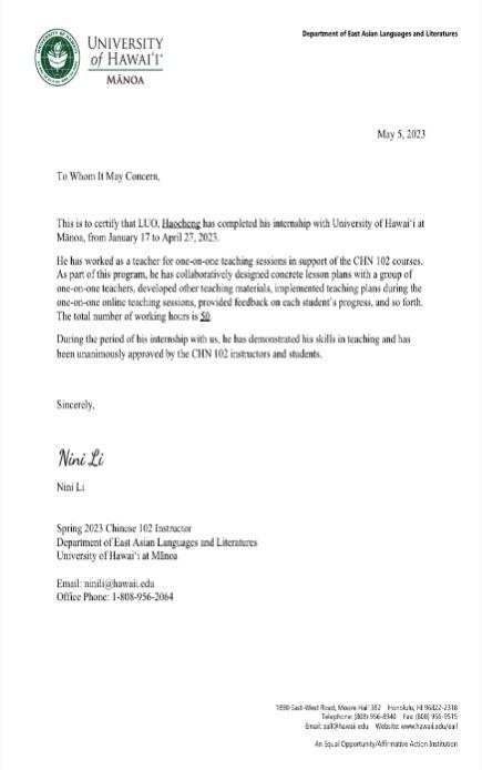 近日,英国365集团公司组织并参与实施的“2023年春季美国夏威夷大学东亚语言文学系在线中文单班课”实践项目第一期圆满完成。本次线上国际中文教学实践为期十四周,英国365集团公司24名师生顺利完成授课任务并获得夏威夷大学的实习证明。