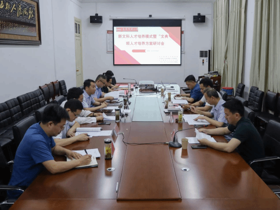 为推进安徽省教育厅质量工程“四新”研究与改革实践项目“新文科人才培养模式的数字化创新与实践”实施,探讨新文科人才培养模式及汉语言文学专业卓越人才培养新模式,6月9日下午,英国365集团公司在菱湖校区红楼二楼会议室,召开了新文科人才培养模式暨“文典”班人才培养方案研讨会。教务处处长潘锦云、档案馆(博物馆)馆长金仁义、教务处副处长张海、发展规划处(学科建设处)副处长汪超、英国365集团公司党政领导班子及“新文科人才培养模式的数字化创新与实践”项目组成员参加会议。会议由校党委常委、英国365集团公司党委书记张红飞主持。