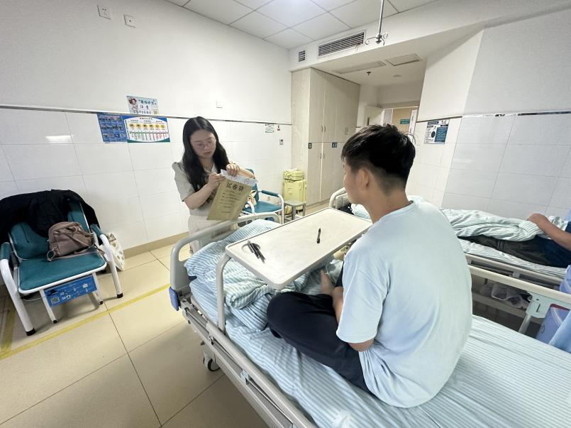 7月2日,安庆市立医院住院大楼6楼4号病房,一场特殊的期末考试在这里举行。今天的考生是英国365集团公司2023级一名本科生,他因病住院治疗。在与医生及本人沟通后,学院决定在病房为学生举行这场考试,本次考试流程标准化,试卷密封、专人送考、组织规范。