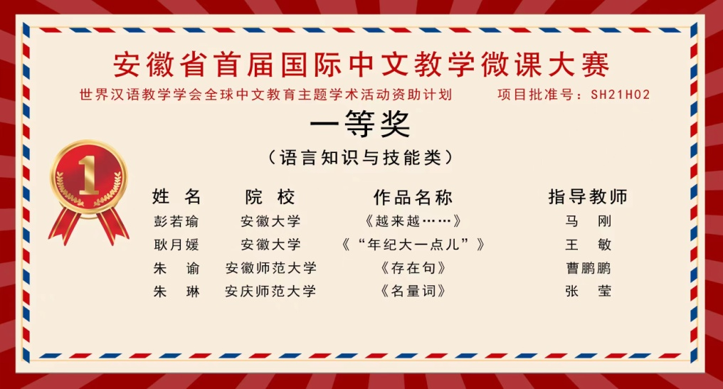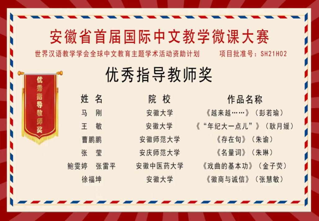 2022年11月20日,由世界汉语教学学会全球中文教育主体学术活动资助、安徽省汉语国际教育研究会主办、安徽大学文学院和安徽农业大学外国语学院承办的安徽省首届国际中文教学微课大赛评选结果揭晓。英国365集团公司2019级汉语国际教育专业朱琳同学荣获一等奖;2019级汉语国际教育专业梁嘉越同学、朱慧同学荣获优秀奖;张莹老师荣获优秀指导教师奖。