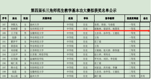 2023年3月,由安徽省教育厅、上海市教育委员会、浙江省教育厅、江苏省教育厅联合主办,安徽师范大学承办的第四届长三角师范生教学基本功大赛落下帷幕。我院2021级历史学专业徐树蕾的《从危局到破局的旧邦新造——辛亥革命》荣获一等奖,我院郝佩林、梁诸英、杨慧英荣获优秀指导教师奖,这是我院学子继2020年以来连续第三年获得长三角师范生教学基本功一等奖。